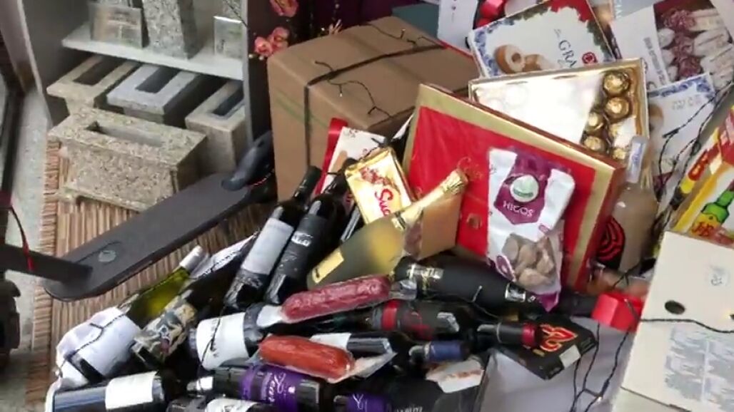Jamón, queso, turrones, vino, una televisión de 50 pulgadas, una cafetera y un patinete eléctrico, están entre los ingredientes de esta curiosa cesta navideña. Pero esta funeraria ha cambiado la cesta de toda la vida por un ataúd.