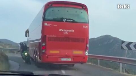 Un autobús ha puesto en peligro a los conductores que circulaban por la carretera Gi-614, que enlaza Roses con Cadaqués, por una arriesgada maniobra. Según muestran las imágenes, el vehículo se queda a pocos metros de embestir a una moto que circulaba en sentido contrario.