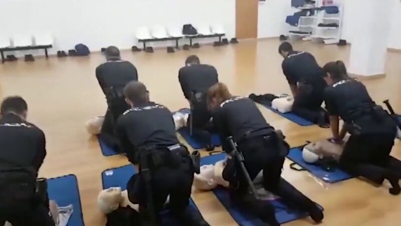 Los alumnos de la Escuela Nacional de Policía en Ávila han enseñado primeros auxilios al ritmo de la famosa canción de Los del Río, 'La Macarena', por el Día Europeo de la Concienciación del Paro Cardíaco.