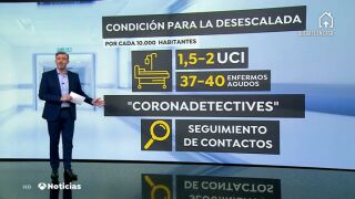 En España, sabíamos que para afrontar la desescalada habría que tener una incidencia baja y camas libres, entre otros indicadores. En la tarde de este domingo, el ministro de Sanidad, Salvador Illa, ha detallado más esas condiciones.Las comunidades autónomas tienen que poder disponer por cada 10.000 habitantes de entre 1,5 y 2 camas de UCI y unas 37 o 40 camas para enfermos agudos, y además ponerlas en marcha en un plazo máximo de cinco días, por si hubiera un brote. Ese es el requisito obligatorio para que los territorios puedan avanzar de fase.