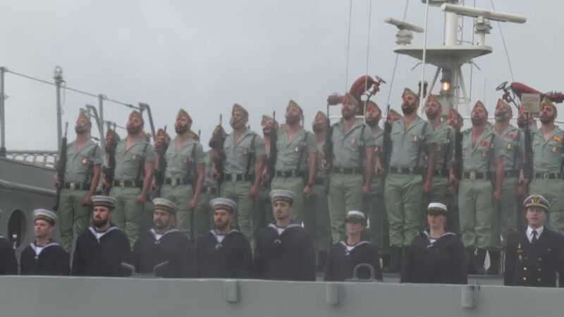 El acto ha comenzado a las 10:00 horas con el desembarco del buque 'Contramaestre Casado' de la Armada de los legionarios, quienes durante las maniobras de aproximación entonaron el 'Novio de la muerte'. Una vez que el 'Contramaestre Casado', ha atracado, los legionarios de la Compañía de Honores del Tercio 'Don Juan de Austria', III de la Legión, han desembarcado y han quedado formados ante las autoridades civiles, militares y religiosas, donde han tocado el himno de España.