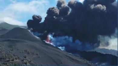 Según los expertos, es posible que la colada de lava del volcán de Cumbre Vieja rebase el otro lado de la montaña de Todoque, pero por ahora muy improbable porque el magma que expulsa el volcán de la isla ha encontrado un camino hacia el mar.