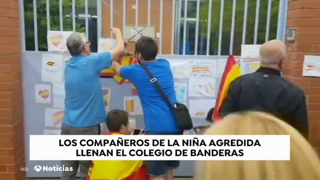 Los asistentes han llenado la puerta del colegio de banderas de España y mensajes de apoyo a la niña. Mensajes como "cobarde, a los niños no se les intimida" se podían leer en algunos carteles colocados a las puertas del Colegio Font de l'alba.