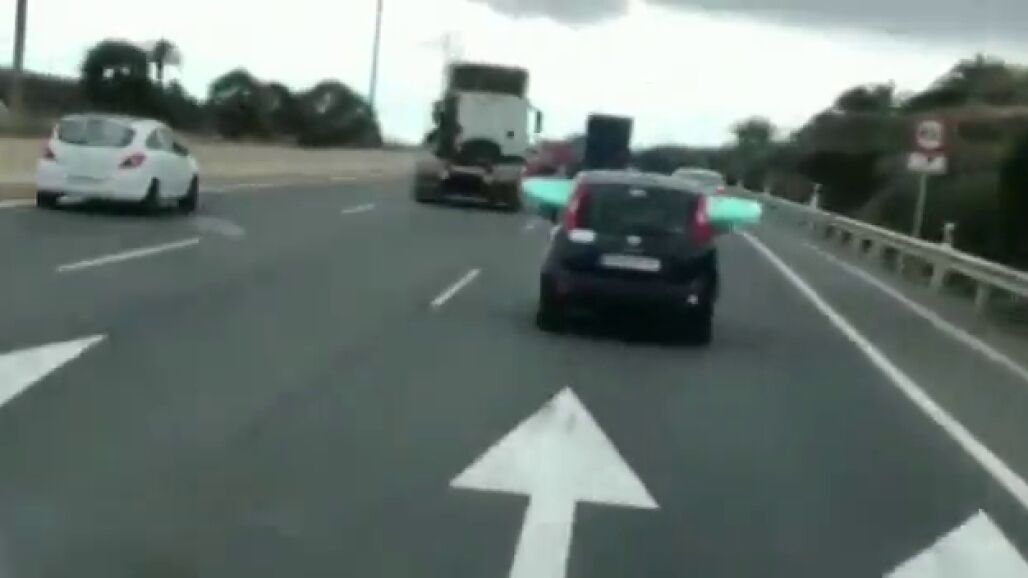 La Guardia Civil ha logrado localizar y denunciar al conductor del coche que Localizan y denuncian al 'surfero de la autopista GC-1' en la Isla de Gran Canaria por circular con una tabla de surf que sobresalía por las ventanillas traseras.