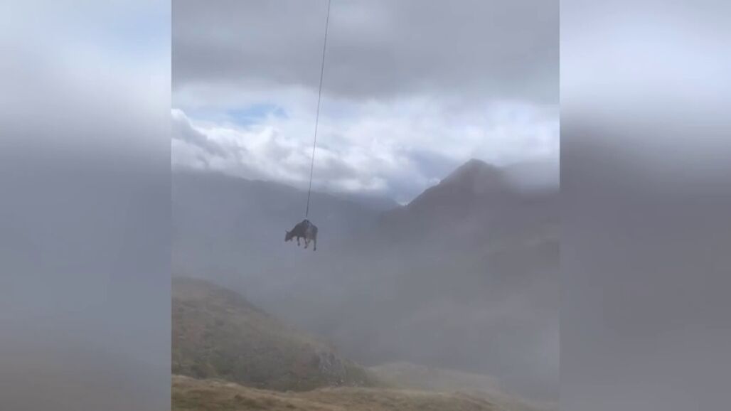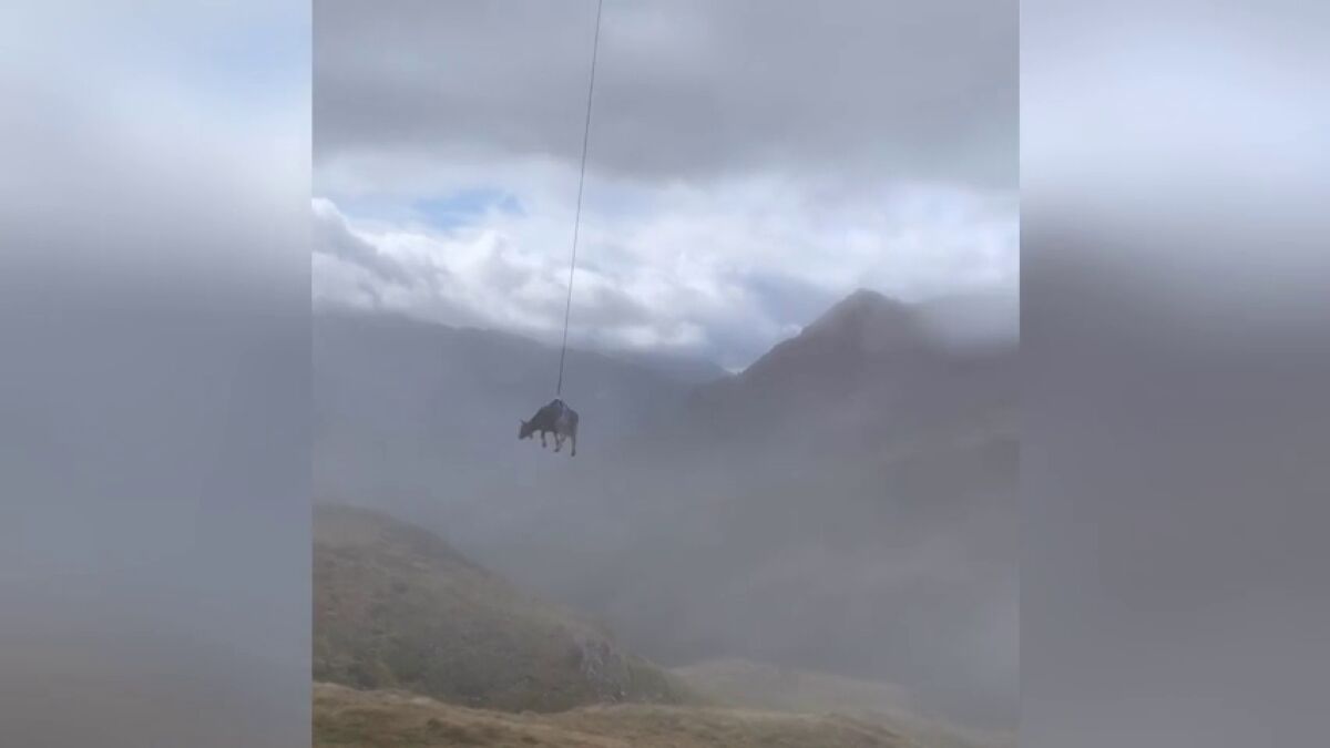 En el vídeo se puede ver cómo un helicóptero levanta a la vaca del suelo con una cuerda y un arnés y se la lleva en volandas montaña abajo. El dueño de la vaca ha explicado que cada día subían a atender y a curar al animal, pero no habían sido capaces de inmovilizarlo.