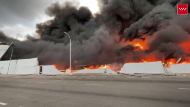 Los bomberos siguen trabajando para extinguir el incendio que afecta a 4 naves industriales de Seseña