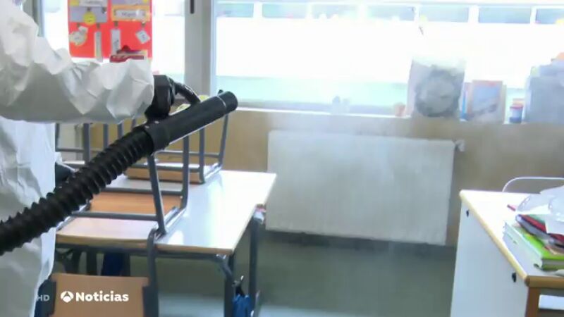 Comienza la desinfección en muchos colegios, primero con una desinfección profesional para eliminar el virus, y después limpiando mesas y sillas y todas las superficies de la forma tradicional.