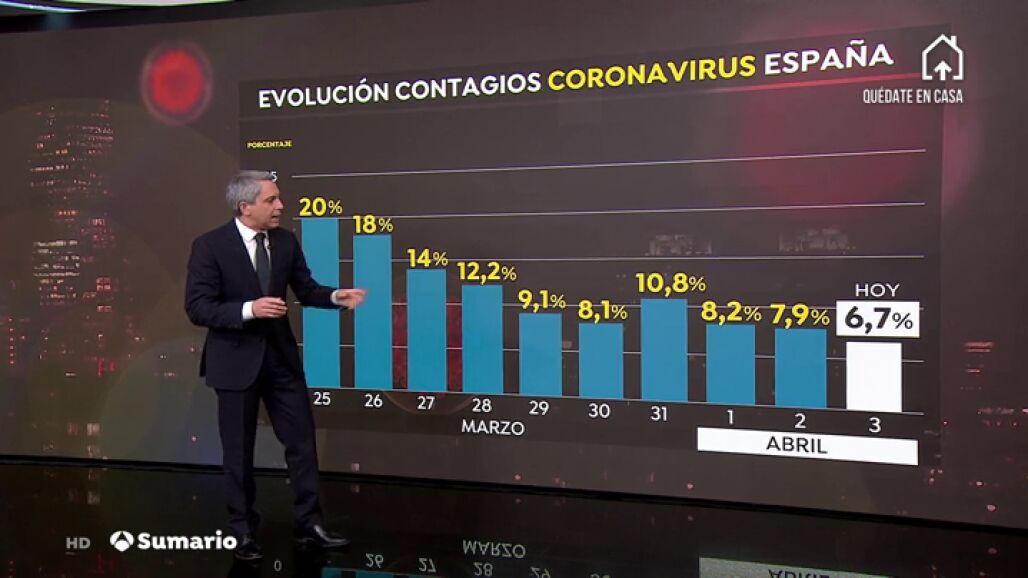 El número de contagios aumenta, el porcentaje al que crece cada día va descendiendo respecto al día anterior. España ha pasado de un 20% de crecimiento el 25 de marzo a un 6,7% registrado el viernes 3 de abril.