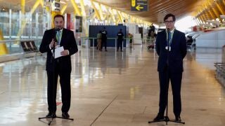 Este domingo se reabren las fronteras a los países de la UE y el espacio Schengen. Por ello, ESalvador Illa y José Luis Ábalos han visitado el aeropuerto de Barajas para explicar los protocolos de seguridad que se van a llevar a cabo.