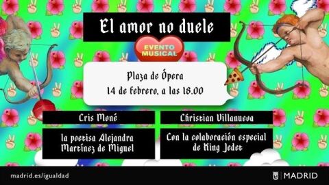 La iniciativa comenzará el 14 de febrero con un evento musical a partir de las 18 horas en la plaza de Opera. Ahí, los cantantes Christian Villanueva y Cris Moné y la poetisa Alejandra Martínez de Miguel actuarán con el objetivo de transmitir a los adolescentes que el amor no es controlar a tu pareja a través del móvil, las redes sociales o controlarle la ropa, sino "una relación de igual a igual basada en el respeto de la autonomía y la libertad de las personas". También estará presente la influencer King Jedet.