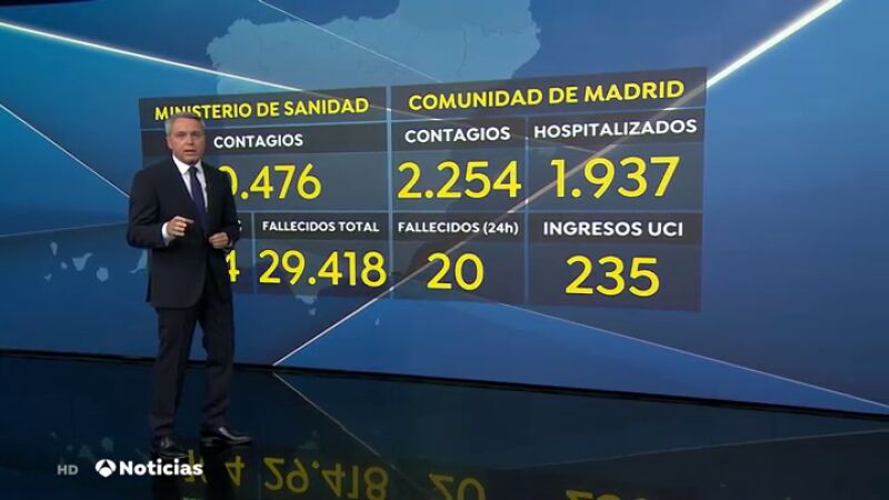 La Comunidad de Madrid ha facilitado sus propios datos, y suma más de 2.200 contagios y 20 fallecidos en las últimas 24 horas. En Madrid hay 1.937 pacientes ingresados en hospitales, y 235 en UCI, lo que supone una decena más que 24 horas antes.