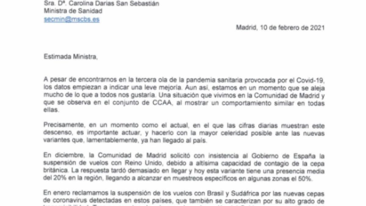 El consejero reprocha también en la carta que en diciembre la Comunidad de Madrid solicitó "con insistencia" al Gobierno de España la suspensión de vuelos con Reino Unido, "debido a la altísima capacidad de contagio de la cepa británica", para subrayar que "la respuesta tardó demasiado en llegar y hoy esta variante tiene una presencia media del 20% en la región, llegando a alcanzar en muestreos específicos en algunas zonas el 50%".
