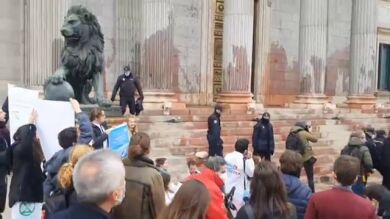 Activistas de 'Rebelión científica' protestan contra la Ley de Cambio Climático frente a la Puerta de los Leones del Congreso.