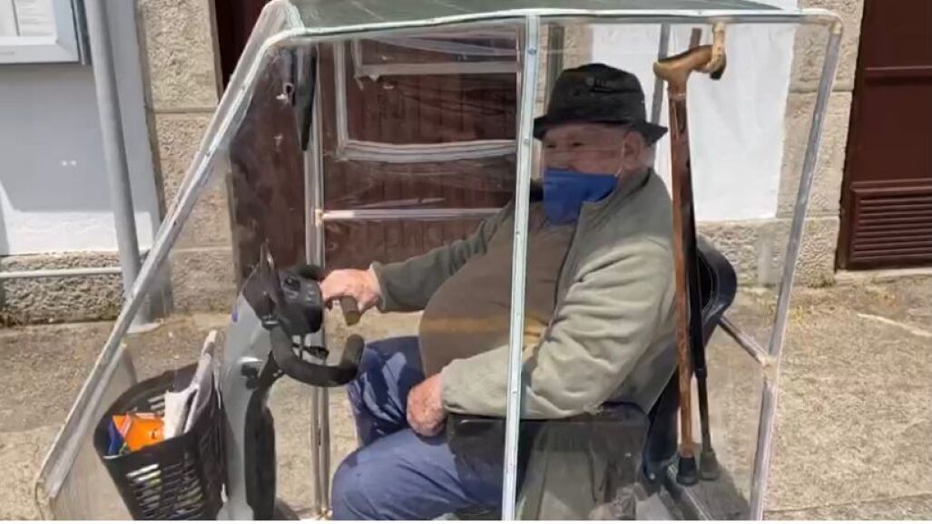 A sus 93 años Manolo ha diseñado una estructura para proteger su moto adaptada de la lluvia. No supera los 8 km por hora, suficiente para recorrer los escasos metros que separan su casa del bar al que va cada mañana a tomar el café con sus vecinos.