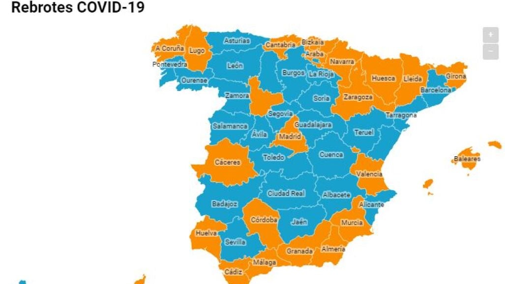 Mapa de los rebrotes del coronavirus en España hoy sábado 27 de junio de 2020