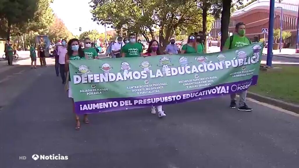 Los manifestantes, entre los que había docentes y padres de alumnos, tenía como objetivo pedir menos alumnos por aula para mantener las distancias de seguridad ante el coronavirus, habilitar espacios alternativos para separar a los grupos de alumnos y más personal docente, de limpieza y sanitario en los centros escolares.