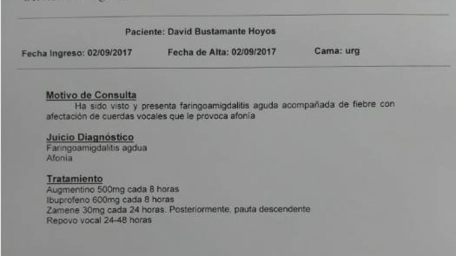 La Junta de Castilla y León ha emitido un comunicado, en el que explica que Bustamante fue atendido por un facultativo adscrito al servicio de urgencias del Hospital Clínico de Valladolid, fuera de su horario laboral y que el Hospital ha tenido conocimiento de este escrito. El médico, que atendió al cantante ha manifestado que la auscultación tuvo lugar en el hotel del artista y ha reconocido el error por el uso indebido de un impreso membretado del Hospital para esta asistencia sanitaria privada.