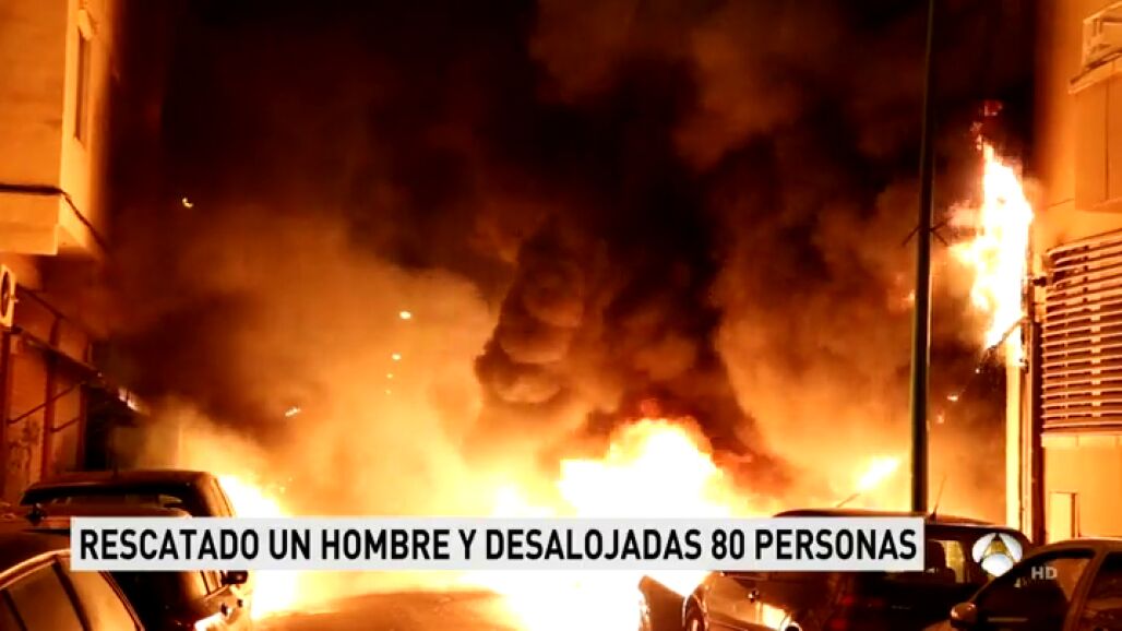 Ochenta personas han tenido que ser desalojadas de sus casas por un incendio, en una calle de Palma de Mallorca. El fuego empezó en unos contenedores de basura, ha afectado a varios coches y el intenso calor ha provocado que estallara el escaparate de un bazar chino. En el interior del negocio, dormía un hombre que ha tenido que ser rescatado por los bomberos con una grave intoxicación por humo.