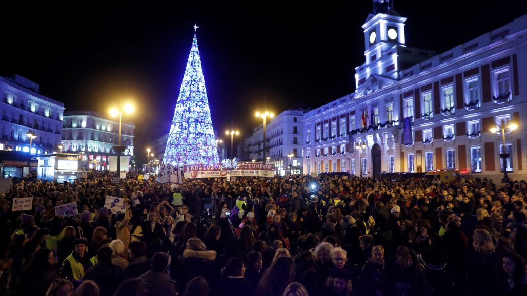 Los asistentes han recordado a las 1.028 víctimas mortales de la violencia machista contabilizadas desde 2003 contando desde 1 a 1.028; una trágica cuenta que han acompañado de cánticos de "Sola o borracha quiero llegar a casa, mi cuerpo es mío, mío, mío" y una marea de banderas moradas.