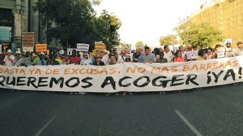 Miles de ciudadanos han salido a la calle en Madrid para decir al Gobierno 'Basta de excusas, Queremos acoger ya' y exigirle que cumpla con los compromisos de reubicar a 17.000 refugiados antes del mes de septiembre. En una marcha lúdica, que ha partido a las siete de la tarde de la Plaza de Cibeles para concluir en la Plaza de España, los convocantes, más de 100 plataformas ciudadanas y organizaciones sociales, han unido su voz para reclamar el fin de una Europa "fortaleza" con los migrantes y refugiados que huyen "de la muerte".