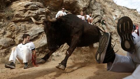 Como cada día, a las 9:00 horas, el cohete da la salida para la bajada del Pilón. Las reses del ganadero local, Teodoro Vergara, que ya dejaron el pasado martes un encierro lleno de imprevistos, volvían a repetirlo esta misma mañana. Tras hacer un amago al comienzo del encierro con salir del camino y subir hacia el monte, han dado la vuelta y han vuelto al corralillo superior.