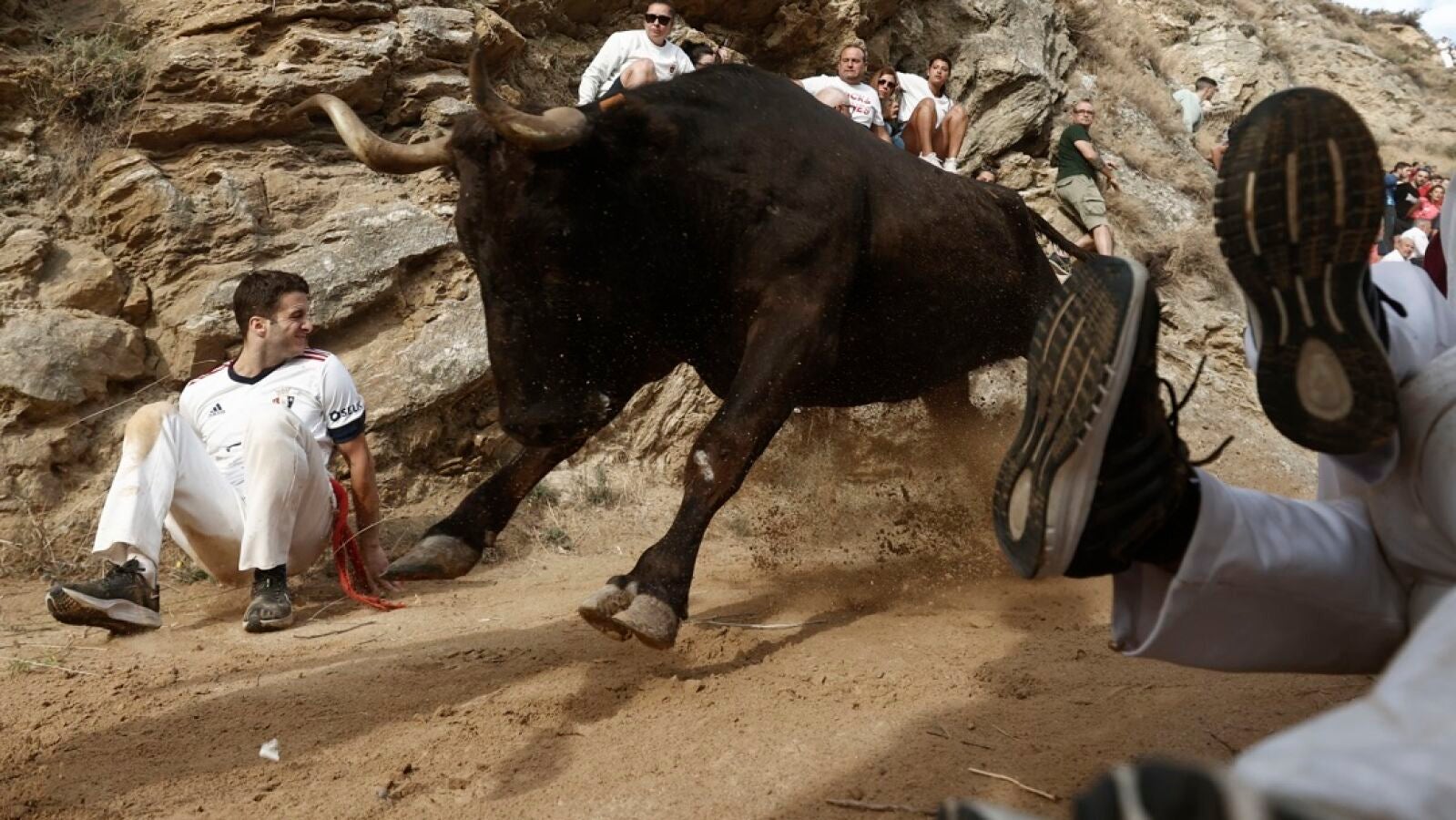 El pueblo de Falces (Navarra) pone punto y final a sus fiestas después de dos largos años de espera. Tras una semana llena de celebración, el cierre ha comenzado con su famoso encierro del Pilón. Una bajada de 800 metros que discurre por un estrecho y empinado recorrido por el monte cuesta abajo, en el que tan solo el muro de la montaña hace de tope a un lado, mientras que al otro se encuentra el barranco que da a la poza del pueblo.