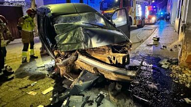 Un coche choca contra la fachada de una vivienda en Jérica, Castellón. El accidente de tráfico ha dejado al menos dos fallecidos y tres heridos. Entre ellos una niña de dos años. El suceso ha ocurrido este domingo sobre las 23.20 horas, según informa el Consorcio Provincial de Bomberos de la Diputación de Castellón.