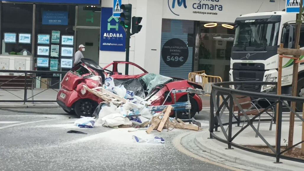 Los milagros existen, y si no, que se lo digan a una mujer de Granada. La joven de 23 años se encontraba conduciendo su coche cuando una carga de materiales de construcción, concretamente un palé con sacos de yeso, ha caído en lo alto de su coche, dejando al vehículo siniestro total.