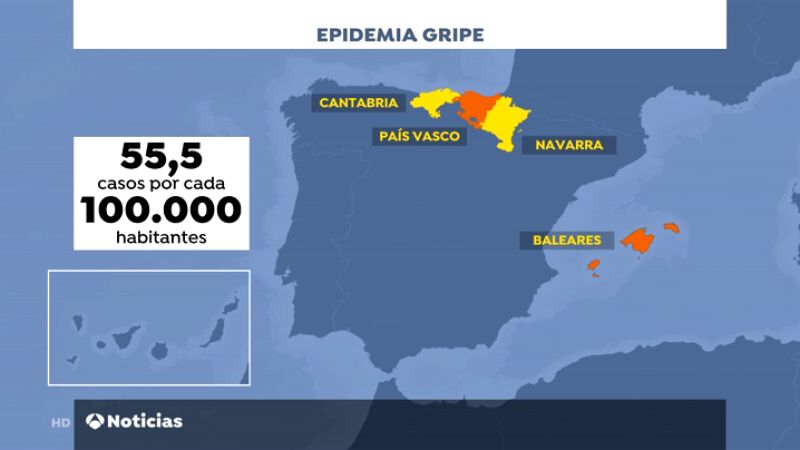 Los contagiados por gripe han alcanzado el nivel de epidemia en Cantabria, País Vasco, Navarra y Baleares. La situación es especialmente grave en País Vasco en donde la incidencia alcanza los 188 casos por cada 100.000 habitantes, especialmente en la provincia de Vizcaya.