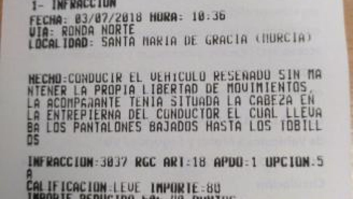El conductor fue parado por los policías locales de Murcia después de que le vieran conducir en 'zig-zag' y descubrieron que la copiloto le estaba practicando sexo oral. Sin embargo, la infracción sobre la libertad de movimiento no fue la única que cometió: dio positivo en el control de alcoholemia, tenía la ITV caducada y carecía de permiso para conducir en ese momento.
