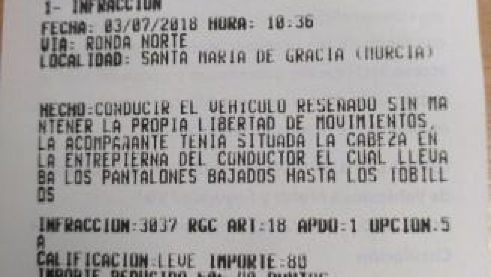 Entonces, los agentes le multaron con 80 euros en un boletín sancionador en la que figura la descripción de lo ocurrido: "Conducir el vehículo reseñado sin mantener la propia libertad de movimientos. La acompañante tenía la cabeza en la entrepierna del conductor, el cual lleva los pantalones bajados hasta los tobillos". Como la infracción está tipificada como leve, el conductor no perderá puntos del carnet de conducir y, además, podrá dejarla saldada con un importe de 40 euros si la paga antes de 20 días naturales.