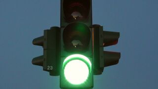 En una calle de un único sentido, en el centro de Ourense, un semáforo se pone en verde y el coche que está en primer lugar, delante del semáforo, no arranca. Detrás está un coche de autoescuela que le pita para avisarle.