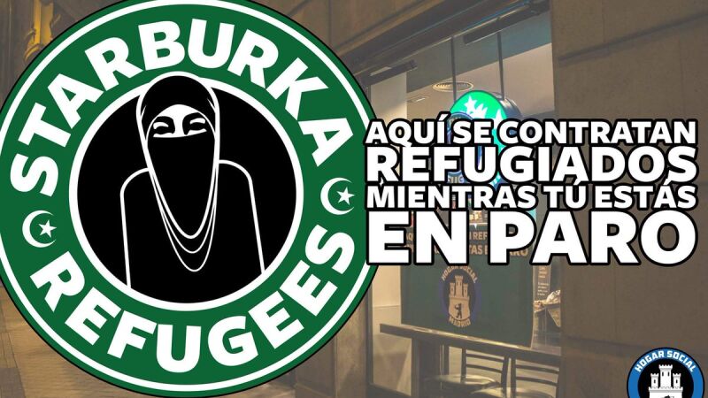 Debido a ello, Hogar Social Madrid, el grupo que lideró la implantación en España del reparto de alimentos solo a españoles con su aparición en 2014, ha acudido a diferentes Starbucks de Madrid donde ha pegado fotos en las que, usando el mismo logo que la empresa estadounidense, se puede leer 'Starburka refugees'.