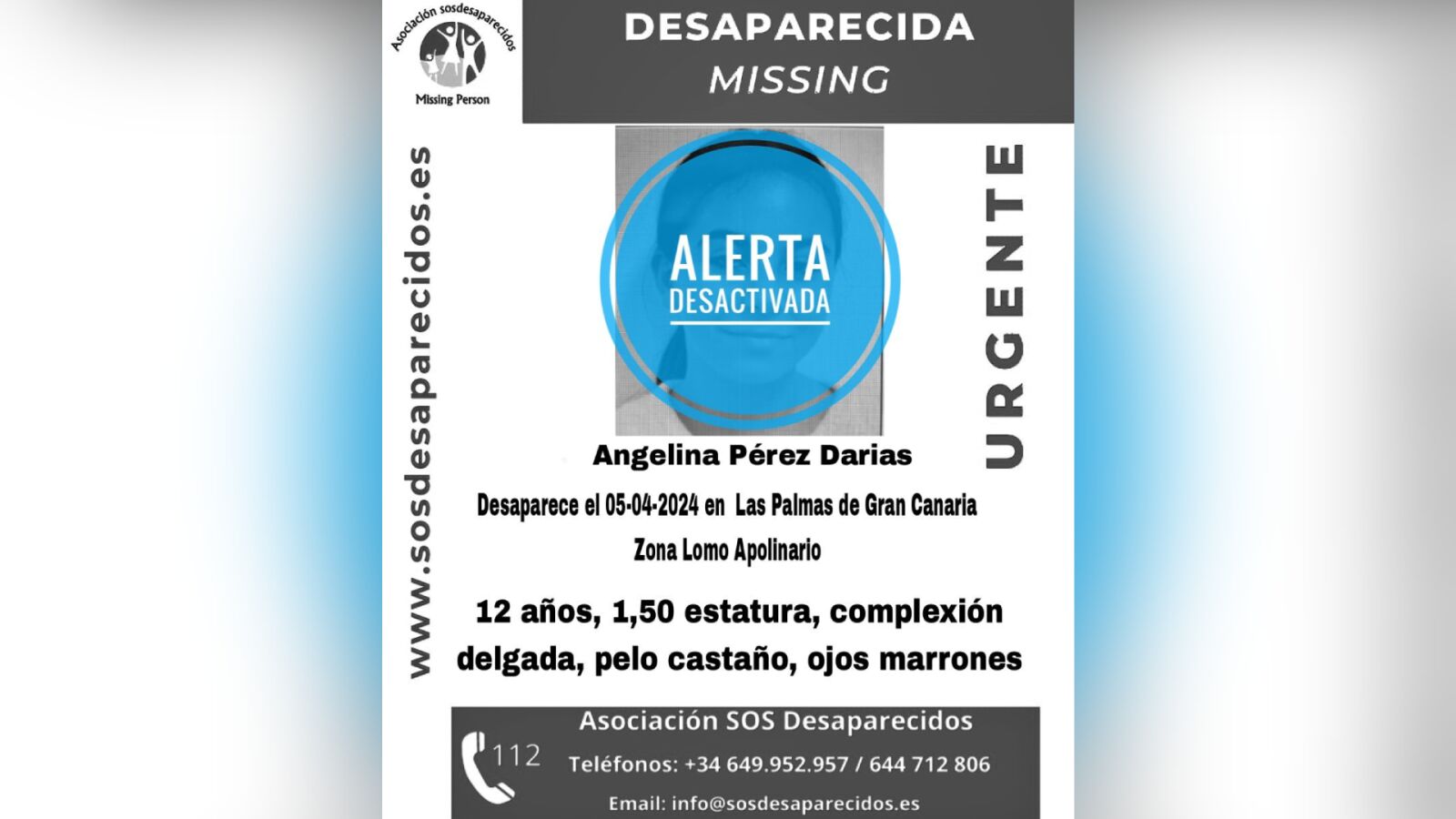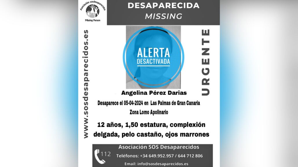Fue vista por última vez en la zona de Lomo Apolinario, en Las Palmas de Gran Canaria. Angelina tiene 12 años y mide 1,50 de estatura, es de complexión delgada, pelo castaño y ojos marrones. En el aviso de SOS Desaparecidos se añade además una foto por si algún ciudadano pudiera identificarla y contribuir a su localización.