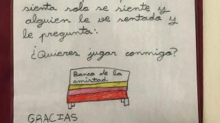 "Hola Ana, me gustaría que haya un banco de la amistad en el patio. Tiene que ser de colorines y un cartel que ponga 'banco de la amistad' para quien se sienta solo, se siente y alguien le vea sentado, y le pregunte '¿Quieres jugar conmigo?", esta es la nota que la niña ha dejado en el buzon de sugerencias del Centro de Educacion Infantil y Primaria Fernando de Rojas.