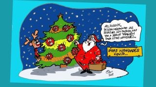 "Ay, Rudolph, desgraciadamente las bolas del año pasado, nos van a servir también para estas Navidades...", dice en la viñeta un triste Papá Noel decorando el árbol de Navidad con bolas en forma de coronavirus.