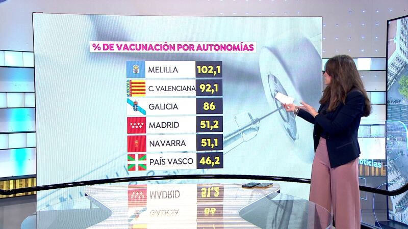 Por comunidades, Melilla es la que más ha vacunado, con el 102% suministrado. Le sigue Comunidad Valenciana con el 92% y Galicia con el 86%. Antena 3 Noticias ha diseñado el buscador CuentaVacunasen el que se puede consultar toda la información detallada sobre la vacunación.