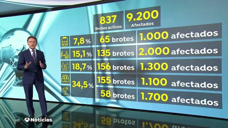 Actualmente en España hay 837 rebrotes de coronavirus activos, con alrededor de 9.200 afectados en total. La mayor parte de ellos, el 34%, se han contagiado en lo que sanidad considera brotes en el entorno social. Son más de 1.100 las personas se contagiaron en alguna celebración familiar y 1.700 las que lo hicieron en bares, restaurantes o locales de ocio nocturno.