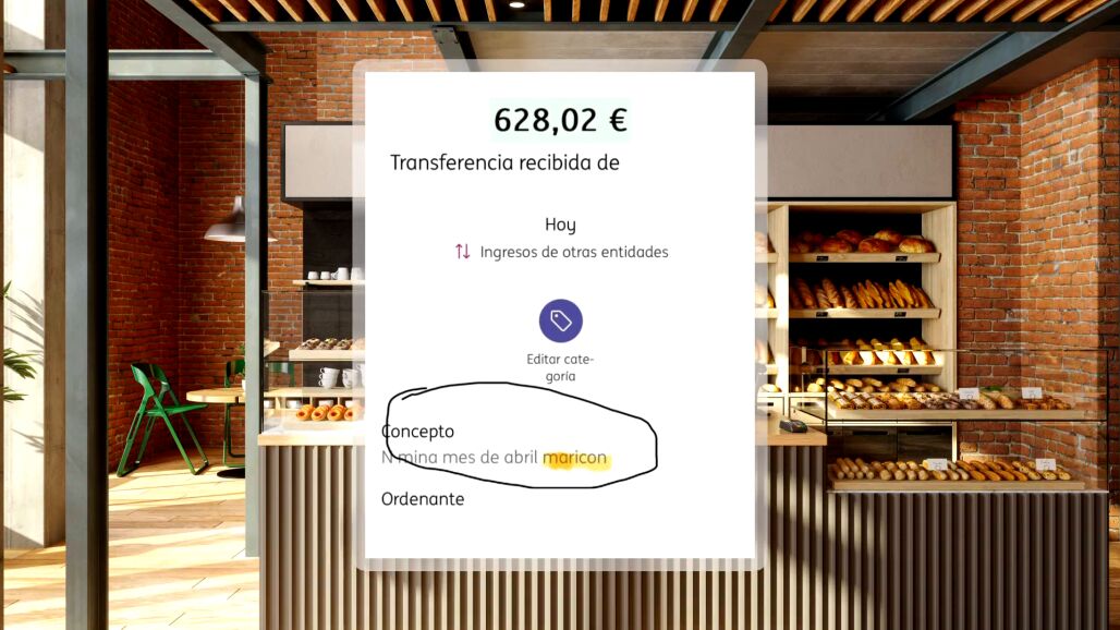 El panadero, de 34 años, no daba crédito al recibir su nómina el pasado 22 de mayo. Era la nómina de abril, transferencia realizada muy por encima del plazo legal establecido, pero lo que más indignó al trabajador fue la frase que aparecía en el concepto en la identificación de la operación bancaria: "Nómina de abril maricón".