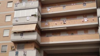 Vecinos de un edificio en Sevilla cuelgan pancartas y globos de su fachada para denunciar que en uno de los pisos, alquilado por varias mujeres, se ejerce la prostitución.