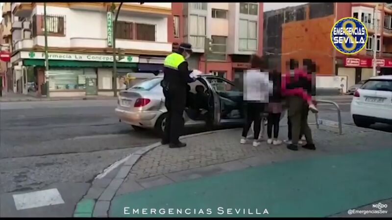 La Policía local de Sevilla ha subido un vídeo en Twitter grabado durante el estado de alarma por el coronavirus en España, de un coche que detectaron con ocho personas en su interior, cinco de ellas niños, además de que no tenía la ITV pasada, tenía una rueda pinchada y los faros rotos.