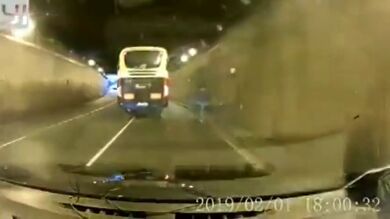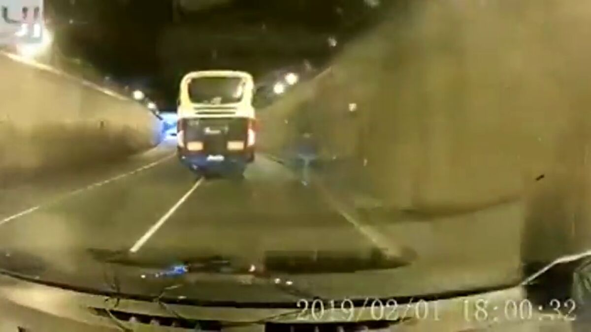 En las imágenes se puede ver como circula en sentido contrario, por un túnel . El vehículo que circula delante del que graba, un autobús, tiene que hacer una maniobra para esquivarlo y se ve incluso obligado a rebasar la línea continúa para no chocar contra el conductor temerario.