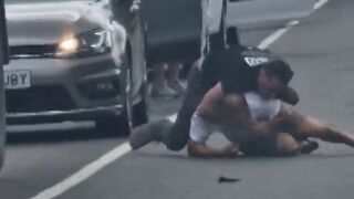 En la grabación se recoge cómo un transportista tiene inmovilizado, contra el firme de la carretera, al piloto del vehículo inmediatamente anterior al camión. Tras varios minutos en los que parece que amaga con asfixiarlo, cesa la agresión. Pese a que el vídeo no tiene audio, sí se ve cómo varios conductores acuden para intentar que frenen la pelea. Posiblemente por su intermedicación, termina el lamentable episodio.