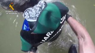 La dificultad del rescate aumenta con la subida del caudal de agua. Se quitan la ropa técnica y se la ceden al senderista para protegerle del frío antes de lanzarse de nuevo al agua. Consiguen llegar a tierra mientras el helicóptero realiza un segundo descenso. Con todos dentro del aparato, éste inicia el vuelo de vuelta entre las paredes del escarpado cañón. Maniobra impresionante, en la que la Guardia Civil ha salvado una nueva vida.