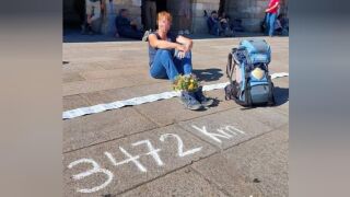Una peregrina pinta en la Plaza del Obradoiro los kilómetros que recorridos en el Camino de Santiago y desata la polémica