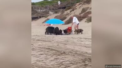 El momento ha sido grabado por otro turista que se encontraban a tan solo unos metros, y en las últimas horas se ha hecho viral. En las imágenes se aprecia como el bañista trata de rescatar su bolso y su toalla e intenta echar a los jabalíes de lugar, aunque sin éxito.