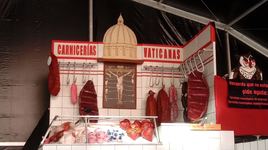Una comparsa que simulaba una carnicería en Bilbao mostraba la imagen de Jesús Crucificado y despiezado como si fuese ganado. El Obispado lo ha denunciado y la Ertzaintza ha retirado la decoración del local a la espera de que el juez decida si es un ejercicio de libertad de expresión o no.