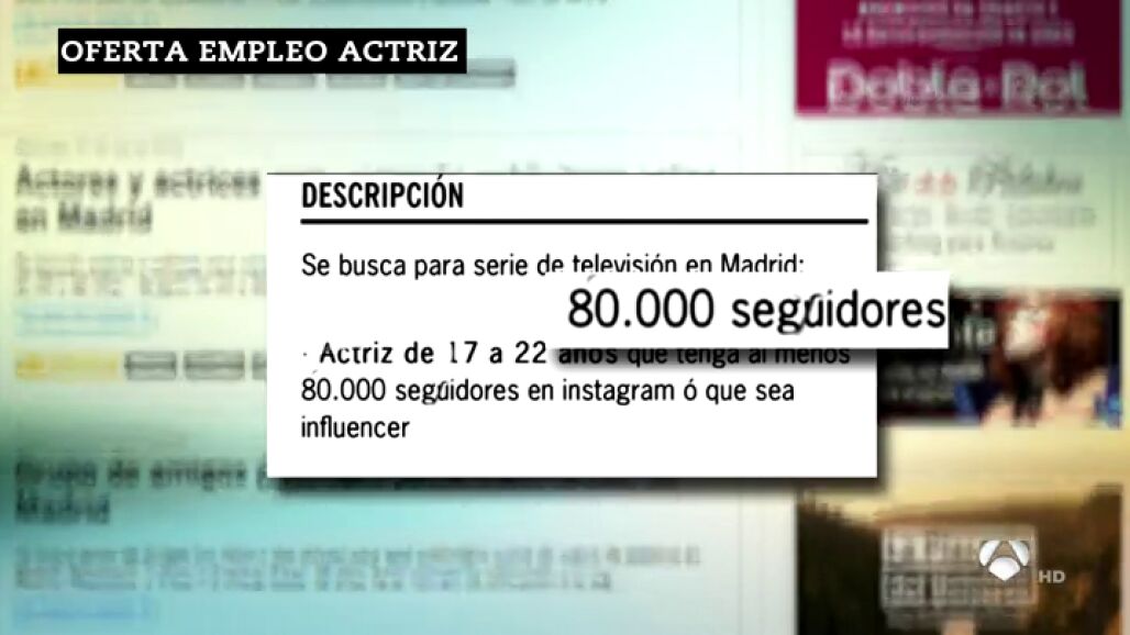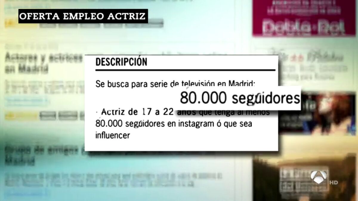 Oferta de trabajo de actriz, con un requisito indispensable: tener más de 80.000 seguidores en redes sociales. El anuncio ha desatado la polémica en el sector, que considera que se empieza a valorar más la capacidad de "influencia en redes" que la calidad profesional y el talento.