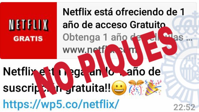 En los últimos días, el uso de WhatsApp para difundir bulos y estafas cibernéticas se ha disparado especialmente. La Policía Nacional ha utilizado su canal de Twitter para advertir a los usuarios de la aplicación de mensajería de una estafa que promete cuentas 'premium' gratuitas de Netflix durante un año.