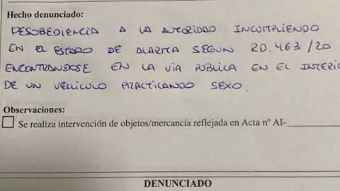 Según consta en la propia denuncia, ambos han sido multados por "desobediencia a la autoridad incumpliendo el estado de alarma encontrándose en la vía pública en el interior de un vehículo practicando sexo".